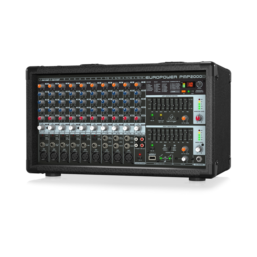 Активный 14-канальный микшер Behringer PMP2000D позиционируется разработчиком как идеальное и простое в использовании решение для живых выступлений. Особенности Behringer PMP2000D: Встроенный усилитель класса D с выходной мощностью 2 х 500 Вт на 8-омной нагрузке и 2 х 1000 Вт на 4-омной; Три режима работы усилителя: стерео, двойное моно (main/monitor) и мостовой; Секция микшера с четырнадцатью входными каналами (6 моно плюс 4 стерео); Дополнительный стереофонический AUX-вход для подключения смартфона, MP3-плеера и других устройств; Трёхполосный EQ, кнопки "Pad" и индикаторы клиппинга на всех моноканалах;