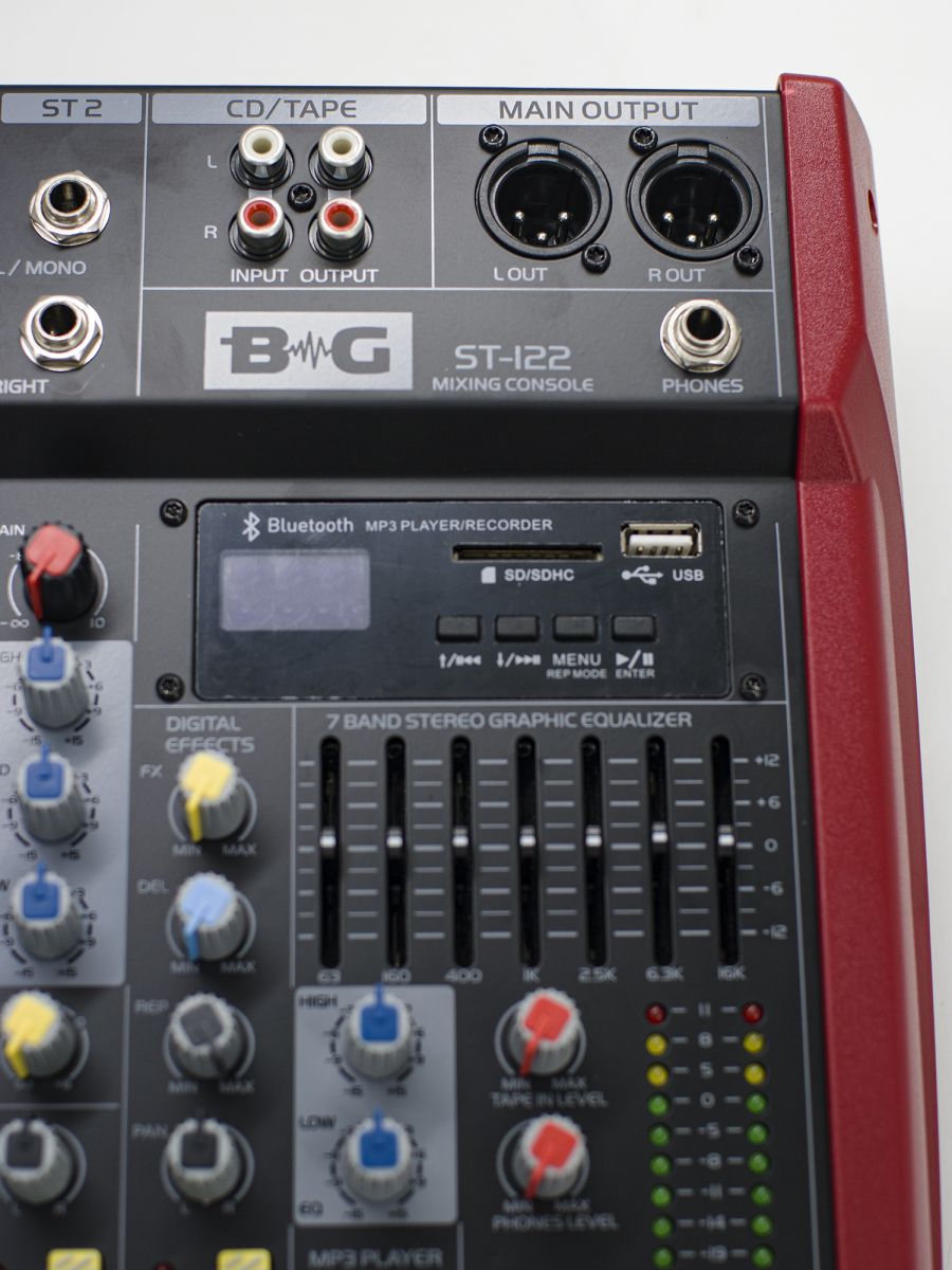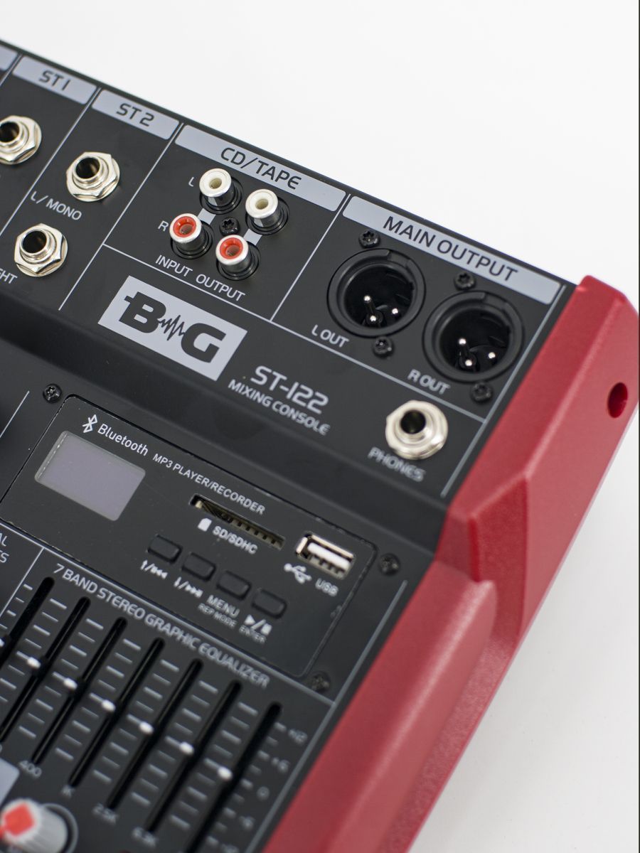 Микшерный пульт обладает компактным дизайном и имеет две прочные боковые ручки. Панель управления может наклоняться на 10 градусов в целях обеспечения наилучшего обзора, что является большим преимуществом. BG ST-122 обладает 3-полосным эквалайзером и процессором DSP-эффектов. Консоль оснащена слотом для карты SD и портом USB. Главной особенностью модели является наличие встроенного MP3-плеера, который может записывать аудиосигнал, исходящий с канала main, и сохранять его в текущий блок памяти в формате WAV. Микшерный пульт BG ST-122 прекрасно подходит для использования дома, на концертах и в студиях.