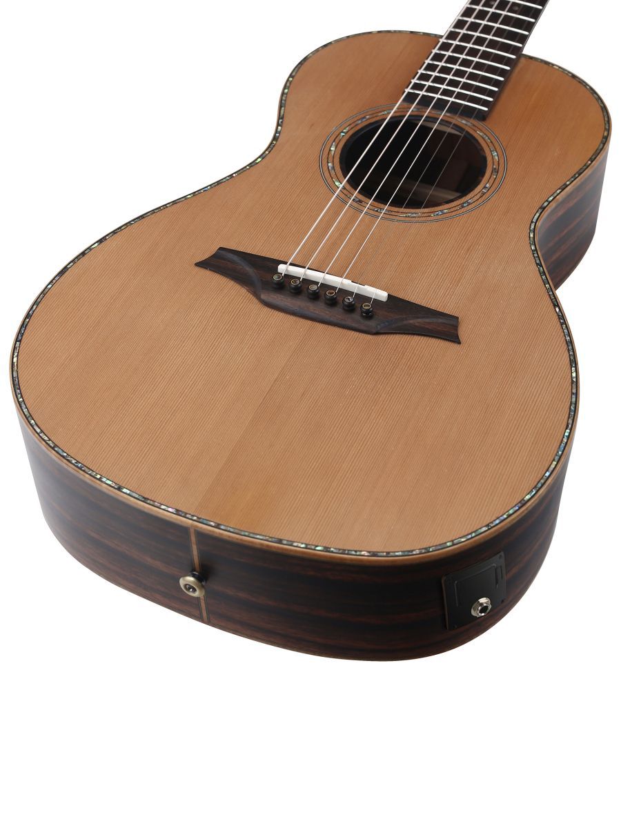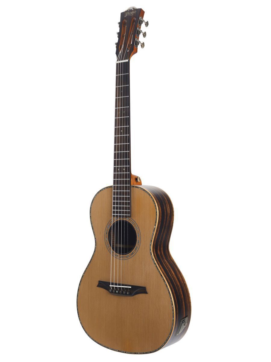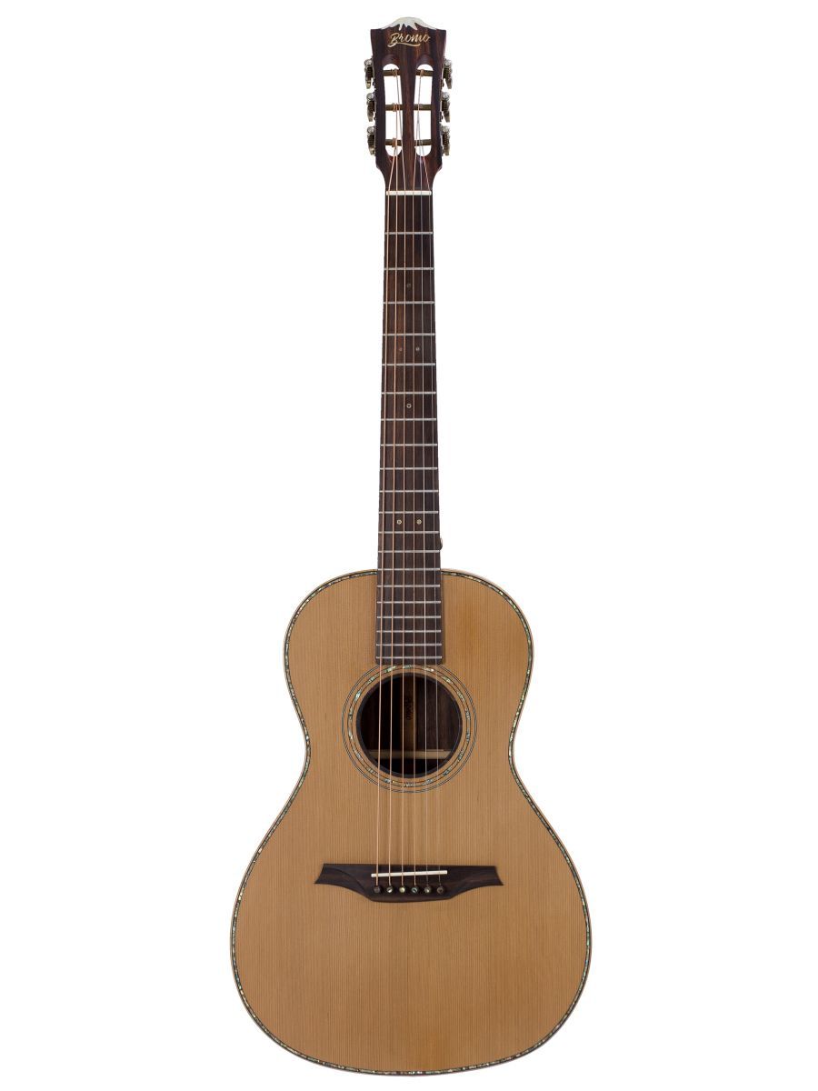 Bromo BAR6E Гитара электроакустическая Parlor, верхняя дека: цельный красный кедр, нижняя дека и обечайка: цельный макассарский эбен, гриф: махагони с двумя эбеновыми вставками, накладка грифа: макассарский эбен, двухсторонний анкер, колки: винтажные "Bromo" античная латунь, электроника: Fishman Sonitone, матовая, в чехле