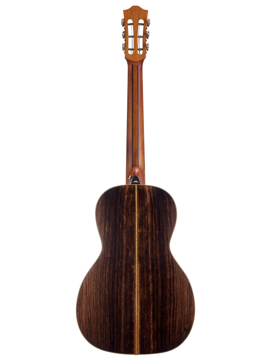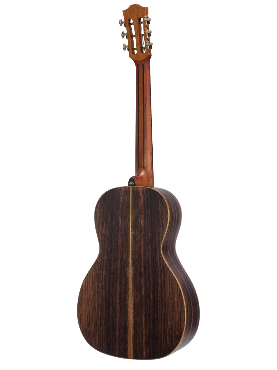 Серия: Rocky Mountain Форма корпуса: Parlor Мензура: 632,4 мм (24 29/32") Ширина грифа у шеи: 47 мм (1 27/32") Верхняя дека: цельный красный кедр Нижняя дека и обечайка: цельный макассарский эбен Гриф / накладка грифа: махагони с двумя эбеновыми вставками / макассарский эбен Анкерный стержень: двухсторонний Инкрустация на грифе: перламутр Лого на голове: гора Бромо Оформление резонаторного отверстия: «Ковбойская веревка» Бридж: "Орлиное крыло", черное дерево Amara Оформление грифа и пятки: гора Бромо Лады: Jumbo, 20 ладов Верхний и нижний порожки: кость Колки: винтажные "Bromo", античная латунь Электроника: Fishman "Sonitone" Отделка: матовая В комплекте: чехол