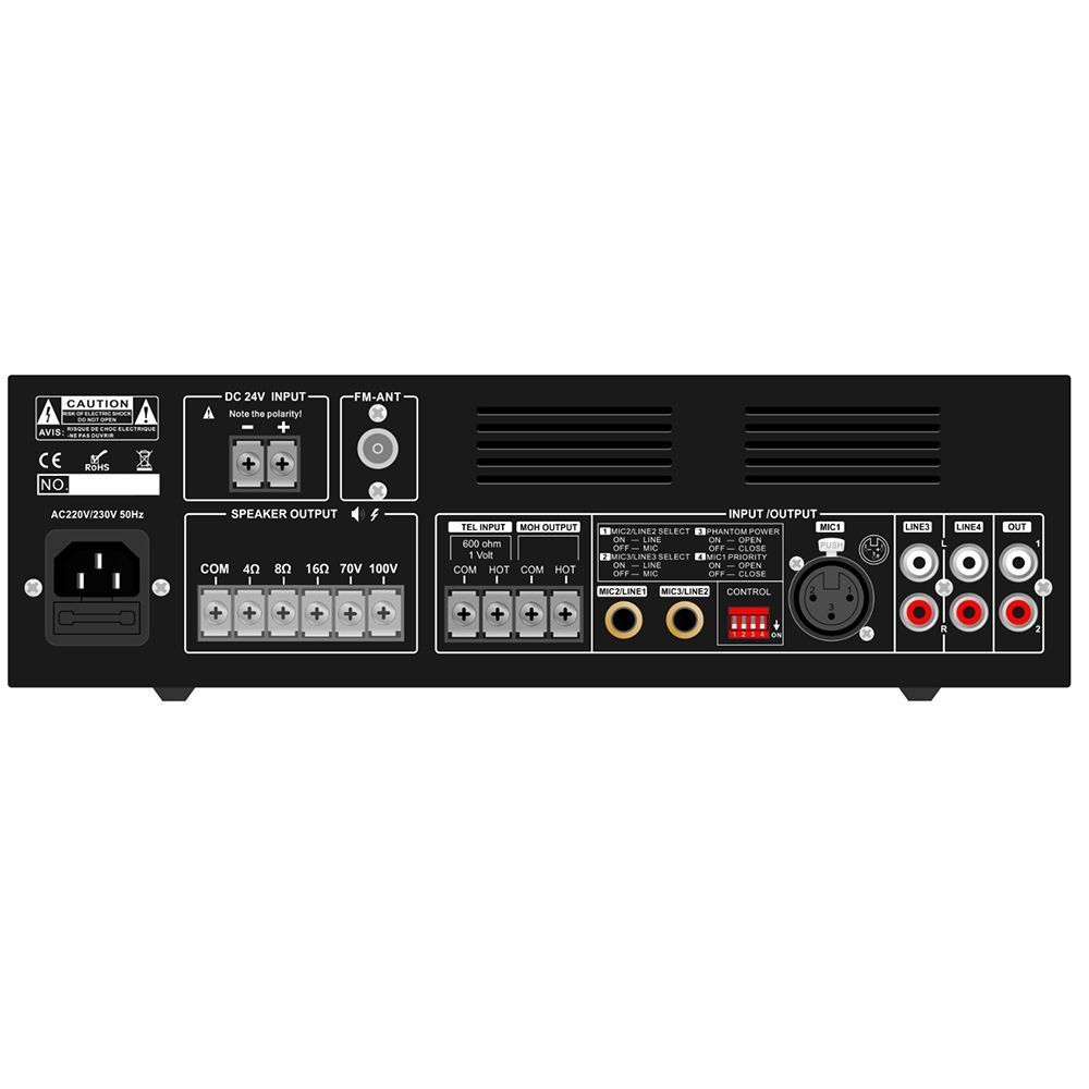 Мощность усилителя, RMS/пик, Вт: 60 Входы: 3 Mic, 2 Aux Выходы: 70V/100V/4-16ohm Размер (ШхВхГ), мм: 300×88х275 Вес, кг: 6,7 Дополнительно: встроенный Mp3 плеер, USB и SD , FM тюнер Пульт управления Mp3: инфракрасный
