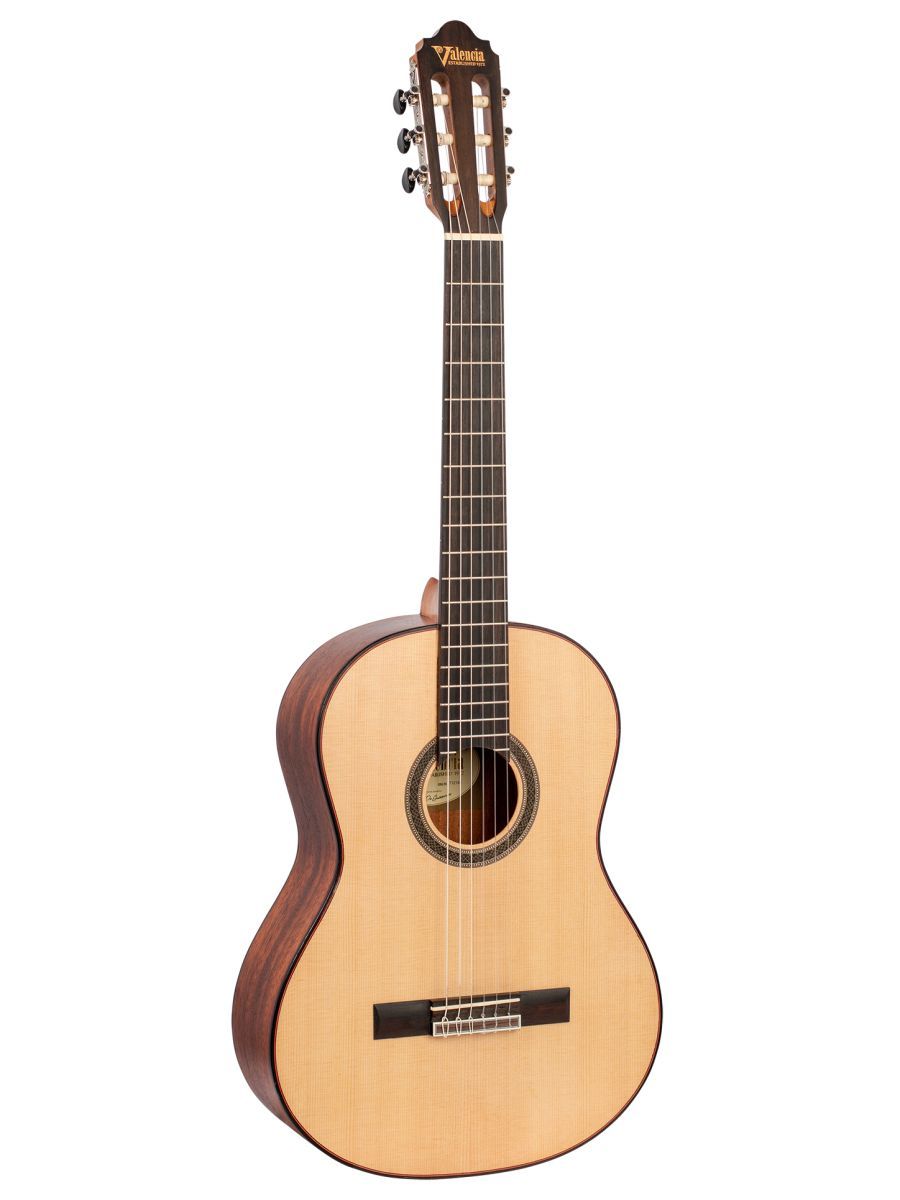 Valencia VC704 Гитара классическая, верхняя дека: цельная ель, нижняя дека и обечайка: махагони, гриф: махагони, накладка грифа и нижний порожек: черное дерево Амара, цвет Natural