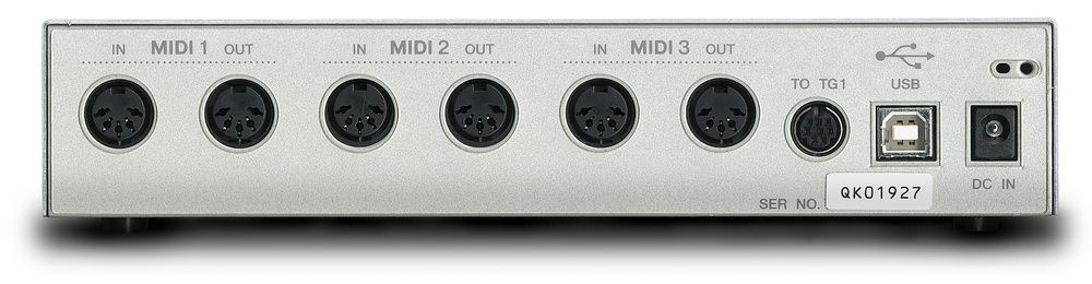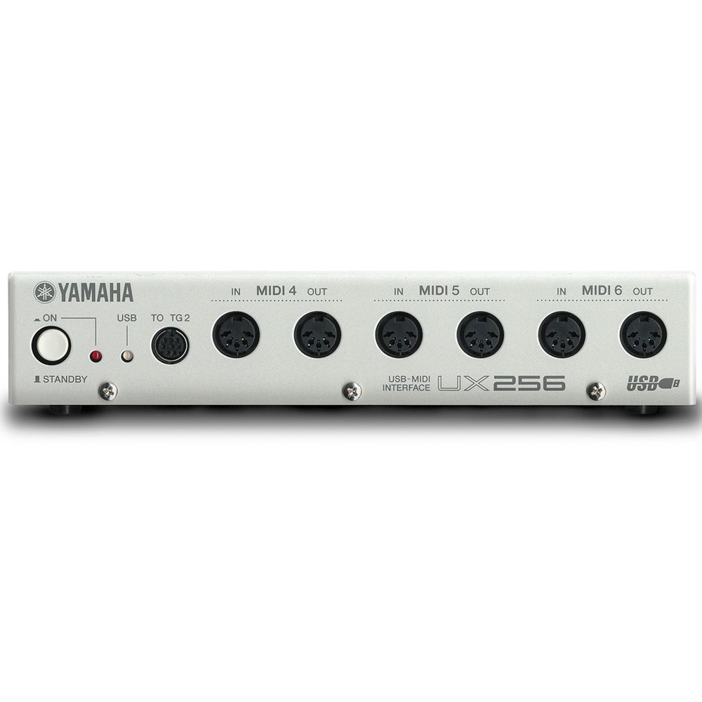 UX256 - это MIDI-интерфейс для подключения к компьютерам Mac или PC через USB. Он обладает корпусом в ½ рэка и шестью наборами MIDI входов/выходов: три спереди и три сзади, что в общем составляет 96 независимых MIDI каналов. Yamaha включила в комплект два маленьких 8-пиновых последовательных разъема, помеченных “To TG1” и “To TG2”, к которым можно подключить любой синтезатор или звуковую рабочую станцию с последовательным подключением, что может быть полезно для пользователей Mac без встроенного порта. Каждый из этих портов может передавать до 5 виртуальных MIDI сигналов или 80 MIDI каналов плюс один входящий MIDI сигнал, что делает его потенциально интерфейсом с 8 входящими и 16 исходящими каналами.